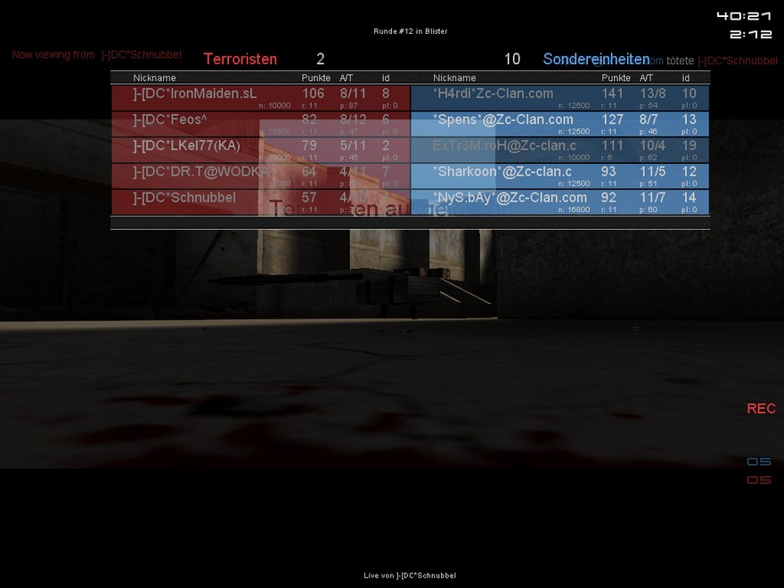 Bericht | Zweites IGL-Match und das zweite mal verloren... Auf Blister hatten wie kaum eine Chance gegen den Gegner. Wir hatten grosse Probleme uns durchzusetzen und taktisch vorzugehen. Somit bashten uns die (Zärtlichen) Chaoten^^ mit 5:19 weg. Auf unserer Homemap Icy Breeze lief es dann einiger Maßen besser. Ich (Kilva) kam ja auch ins Spiel. ![]() Auf Terror konnten wir ein 7:5 gegen ]Z¢[ holen. Um ein Unentschieden noch zu bekommen mussten wir auf Swat ein 12:0 holen. Wir führten 7:0 und versauten es in der nächsten Runde und somit hatte ]Z¢[ schon gewonnen. Trotzdem kämpften wir bis zum Schluss weiter und holten uns 8:4 Punkte. PS: ExTr3M.roH von ]Z¢[ sollte doch bitte mal seine I-Net Probs beheben. Es kann nicht sein, dass er alle 2 Runden rausflog !!! Trotzdem bedanken wir uns für das Flamefreie Match gegen Spens und sein Team. |