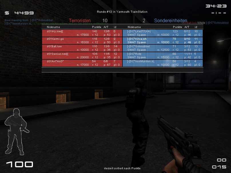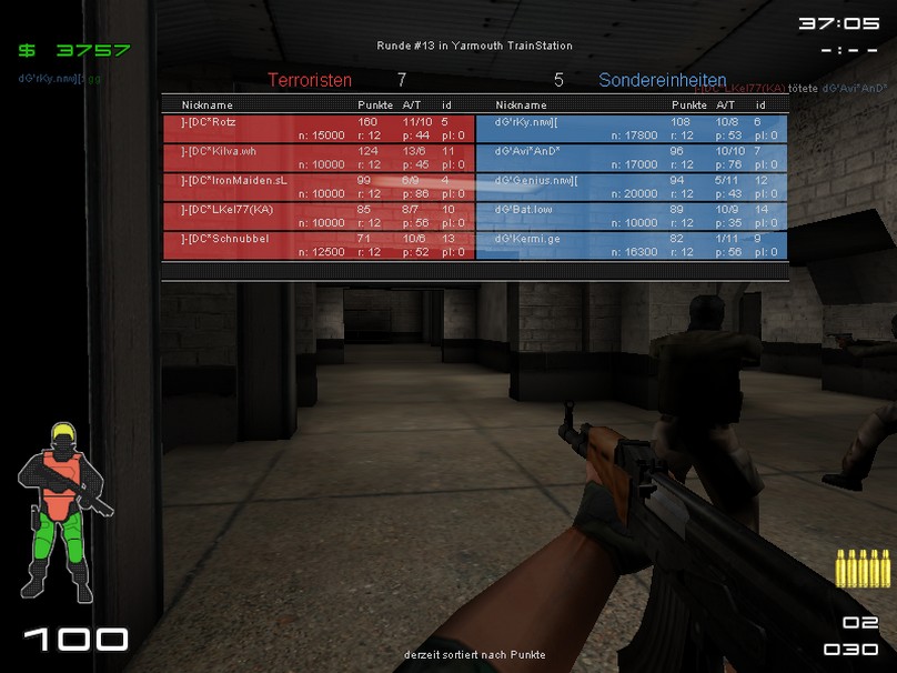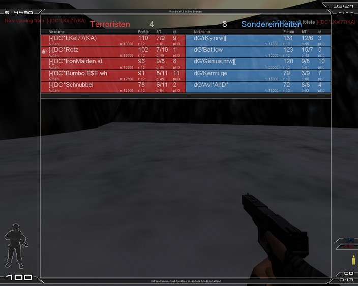 Bericht | Funmatch gegen damn Gaming... Der Gegner musste sich erstmal gedulden, da uns der 5. Mann fehlte. Doch mit einem Anruf konnten wir Rotz um Hilfe bitten. Spontan entschied er sich um mitzuzocken. Thx nochmals an Rotz und natürlich auch an damn Gaming für das lange warten. Nun konnte es beginnen... Trainstation Terror waren die Posis gut platziert und der Gegner hatte schon einige Probleme dort durchzukommen. Mit einem Punktestand von 7:5 holten wir die Punkte nach Hause. Auf Swat lief es dann ein bisschen anders^^ dG gab uns kaum eine Chance bei denen durchzubrechen und somit holten wir nur 2:10 Punkte. Auf ICY sprang dann Bumbo für den kranken Kilva ein (ich [Bumbo] wurde auch angerufen^^ war aber zu spät für die erste Map da) Als Terror ging es ganz gut los, doch im weitern Warverlauf steigerte dG ihre Leistung bzw. ihre Waffen wurden dicker, was es uns nicht leichter machte. 4 Runden konnte wir holen. Als SF haben wir am Anfang ein wenig umgestellt... mit wenig Erfolg 0/3 naja für so was ist ja ein FM da. Mit den alten Posis bzw Taktik ging es dann doch wieder besser und wir konnten uns noch ein 6/6 erkämpfen! Danke an dG für diese Lame und Flamefrei Match! Nochmal sorry, das wir euch warten lassen haben ![]() |
