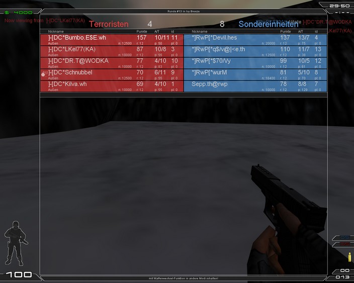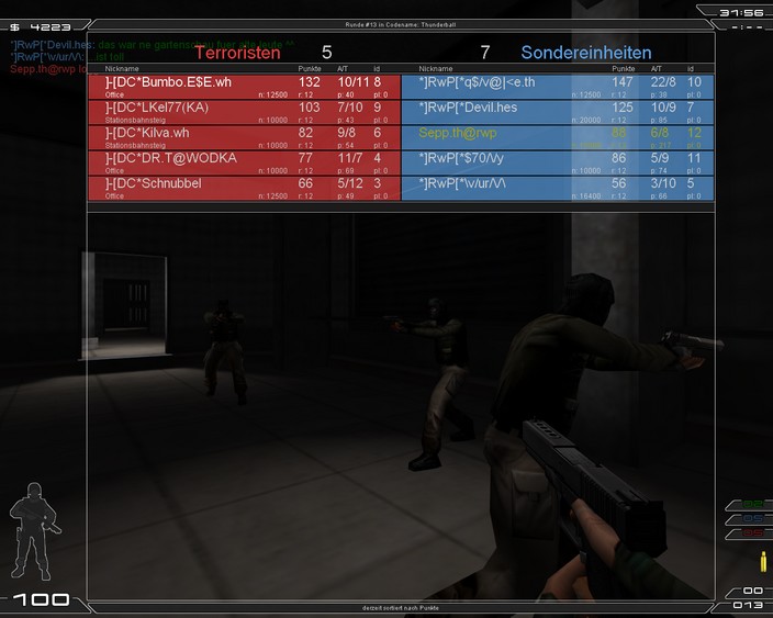 War ganz lustige bis auf unsere Leistung! Auf ICY sind wir schon wie die kopflosen Hühner rumgelaufen und auf Thunderball wurde es auch nicht besser. Außerdem waren einige mit dem Server nicht zufrieden bei uns. Mich (Bumbo) hat der Server nur in einer Runde angekotzt. ICY ich stehe hinter der Tür im dunkeln, warte auf den Gegner (16hp), der schleicht durch die Tür... ich geh vor schieße!!! Nix passiert außer eine rote Lampe! Der Gegner ist auf einmal weg und dann steht er vor mir und knall mich ab... naja egal! RWP war heute einfach besser bzw hatte das bessere Team am Start und hat dieses lustige FMchen verdient gewonnen.