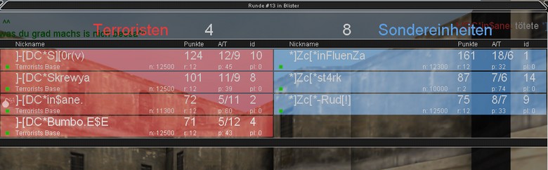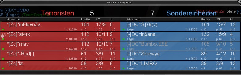 Bericht | Shooterarena Match Nr. 10 Wir fingen heute mal mit unserer Map an, weil wir nicht gleich BlisterBash bekommen wollten. Dort hat ZC sehr gute Leute und Blister liegt uns allgemein eher weniger. Auf ICY ging es dann auch gleich bescheiden los. Unsere Terrortakke ging gar nicht auf. Mit Glück konnten wir 2 Runden holen. Als SF standen wir dann deutlich besser und konnten sogar die Mapsseite gewinnen ![]() Auf Blister spielen wir dann gar nicht so schlecht, aber es reichte trotzdem nur für 7 Runden auf beiden Seiten. Danke an ZC für dieses schöne Match PS: Nach dem letzten Match wurde ich noch übelst von Spens angemacht, warum wir PH und Co. genommen haben, ratet mal was sie diese Match genommen haben ![]() So viel zu: So lange ich bei ZC bin, spielen wir ohne "Lamerwaffen" ![]() PSS: Dies ist kein Vorwurf, dass ihr die Waffen benutzt habt ![]() ![]() Es soll nur zeigen, wie schnell so mancher seine "Ehren" Meinung ändert... Rückrad ftw ![]() |